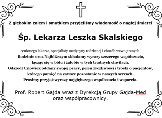 Z głębokim żalem i smutkiem przyjęliśmy wiadomość o nagłej śmierci Śp. Lekarza Leszka Skalskiego cen...